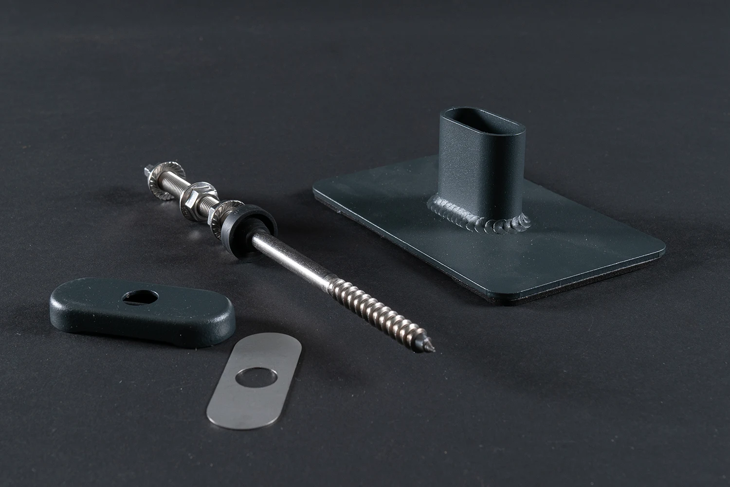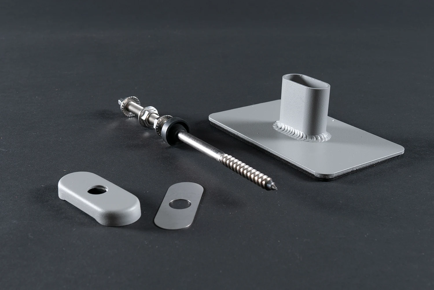 Komponenten: Montagegrundplatte mit aufgeschweißter Ovalhülse und aufliegender Edelstahl Gleitschiene mit Abdeckkappe. Die Auflagefläche der Montagegrundplatte besitzt zusätzlich eine EPDM-Zellkautschukdichtung um eine sichere Eindichtung zu gewährleisten.